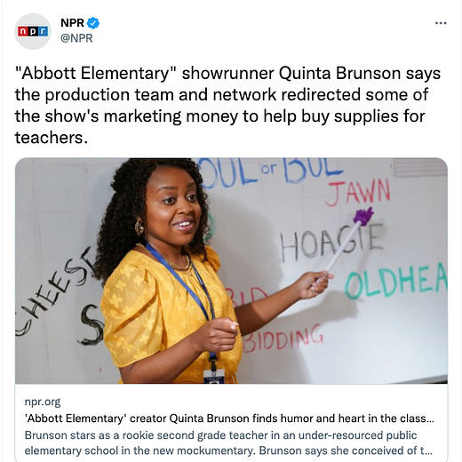 i perhaps naively think it’s possible to do so. if you want to be authentic, do authentic things. i love Abbott Elementary redirecting marketing funds to buy school supplies, for example. when i worked on Handmaid’s Tale, it was important to me that we actually donate to women’s charities or partner with relevant orgs, not just have an instagram that armed women with feminist memes or show clips to go viral. one of the longest debates in present-day climate is how brands engage marginalized communities; it took years to get us to a state of normalcy wherein brands know they need to do their little icon and banner changes for Pride Month, and now, we push to get them to do something to support the LGBTQ community- or better yet, we push back against them if the actual company policies or products weren’t built with that community in mind at all.